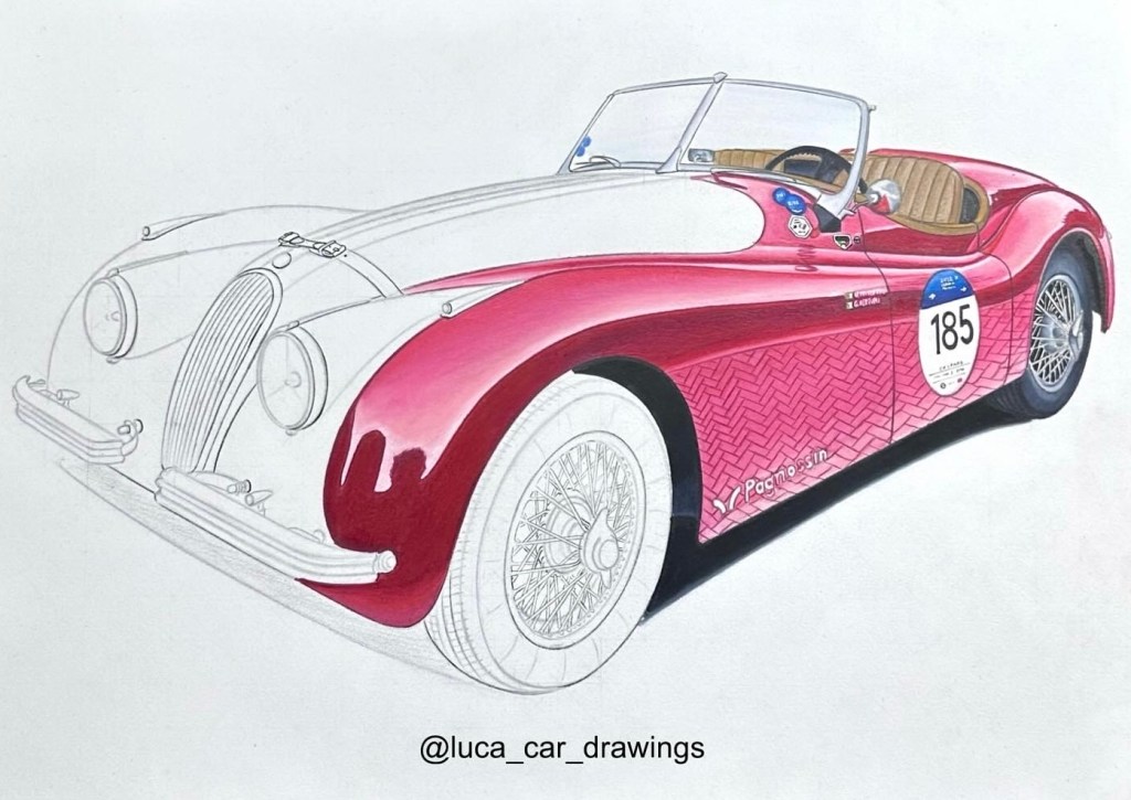 Si inizia con lo schizzo a matita (solitamente HB) , dove viene abbozzata l’intera automobile. Si parte a fare il perimetro del veicolo e di seguito vengono definiti i vari dettagli, quali i cerchi, i fari, ecc… Una volta completato lo schizzo si procede a stendere il colore: vengono utilizzati pennarelli a base alcoolica, come i Copic o i Promarker, e dopo aver fatto asciugare il tratto del pantone è possibile procedere con le matite colorate. Qui a lato è raffigurato un Work In Progress del lavoro, dove si nota la differenza tra schizzo e colore steso.